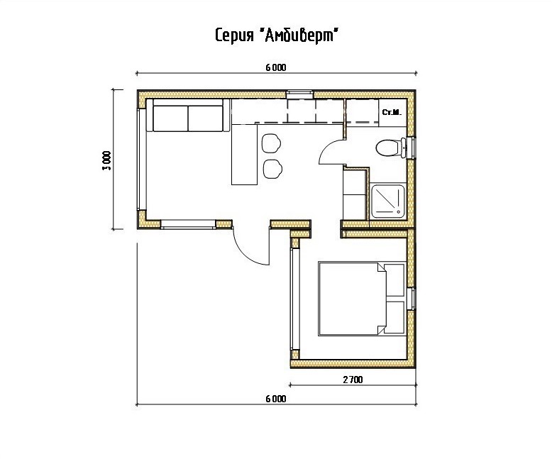 - "Амбиверт" спаренный модуль 6 х 3 х 3 м и 2.5 х 3 х 3 м. Включает в себя спальню, кухню-гостинную и санузел.