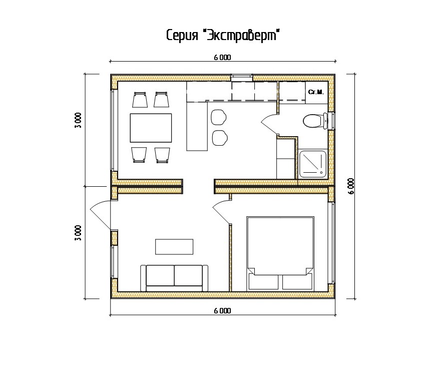 - "Интроверт" одинарный блок-модуль 6 х 3 х 3 м. Включает в себя кухню-гостинную и санузел.
