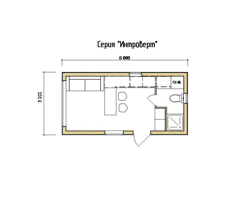 - "Интроверт" одинарный блок-модуль 6 х 3 х 3 м. Включает в себя кухню-гостинную и санузел.
